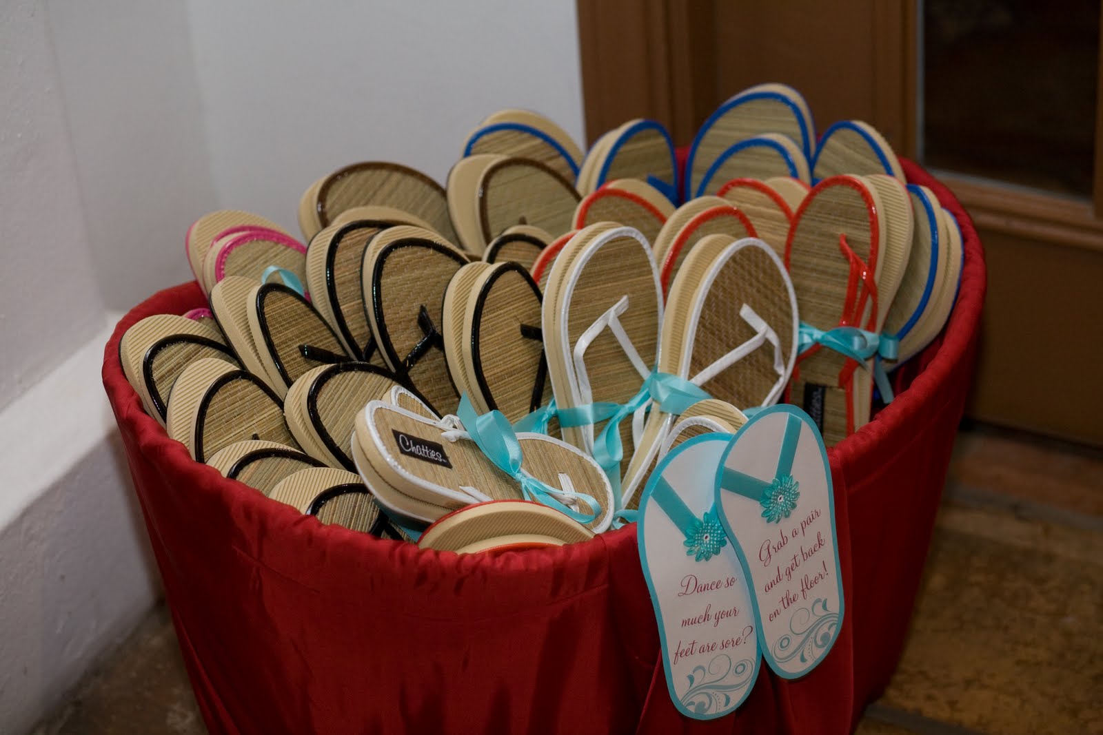 Our Flip Flop basket covered in red silk fabric holding 72 pairs of multi-colored flip flops: